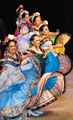 During a recital of “El Gallo” from Sinaloa, the women merrily twirled their flower-patterned, tropical skirts like pinwheels. For a song from Chiapas called “Las Mujeres que si Pintan,” they wore a lace embroidered floral gown, holding a yellow handkerchief while sensually swaying with one hand on their hip.