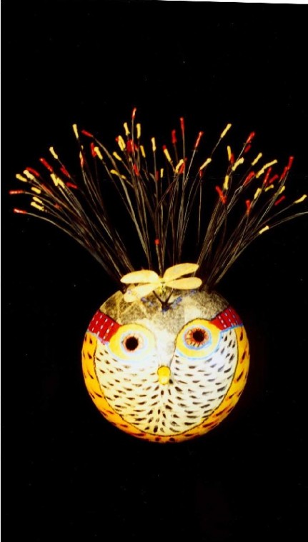 Gourd art is most often decorated in simple patterns or in a Native American style, but Host tries to break these norms with her art.