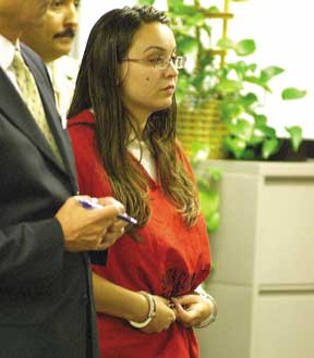 Peralta and Agriesti attended the hearing Tuesday dressed in red prison garb, generally the color reserved for homicide suspects, in shackles and manacled. During most of the court appearance, Agriesti had her back turned to the audience in the courtroom, which was filled with supporters for both the defendants and victim. At times, she shielded her face with her slipper-type shoe. Peralta kept his head down during most of the proceedings.