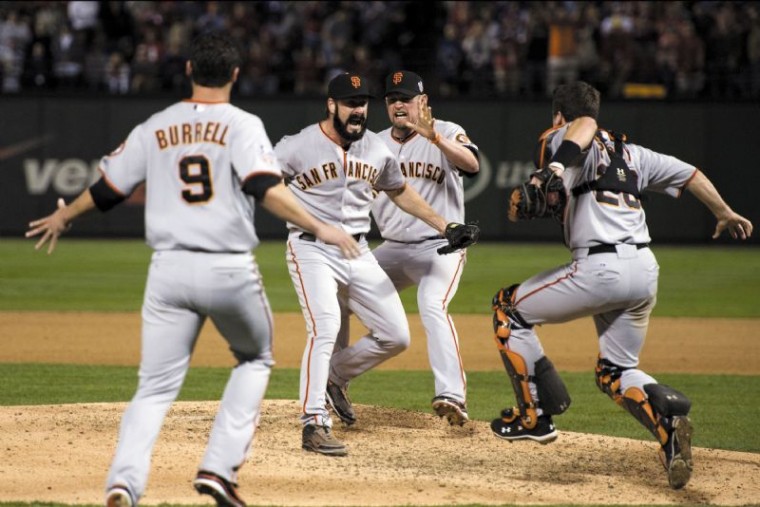 NLCS MVP Cody Ross reached in the seventh, leading off with a single. Juan Uribe followed with a single, giving either team its first legitimate threat. Huff came next and dragged a bunt down the first-base line for his first career sacrifice. Lee struck out Burrell for the second out but, with the crowd up and whirling their white towels, Renteria hammered the lefthander’s 2-and-0 pitch over the wall in left-center, setting off a celebration in San Francisco that was topped only by the one ensuing when the third out of the ninth was recorded less than an hour later.