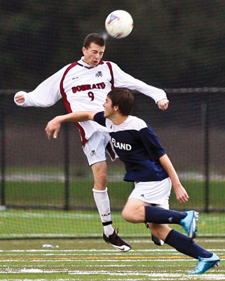 Sobrato’s Scott Henningsen battles for a header with Leland