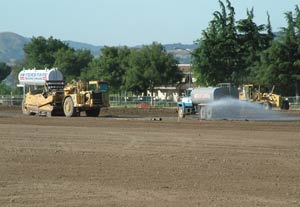 Redevelopment Agency funds are at work here, taking out two of the six existing natural grass soccer fields and replacing them with two synthetic fields. This is the beginning of phase one in the improvements of the 38-acre site on Condit Road which includes the construction of sidewalks and curbs to match the street improvements already in place at the nearby Aquatics Center. Other ammenities will include restrooms, lighting, bleacher seating and a concession area.