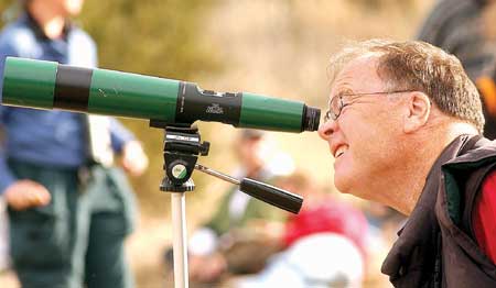 State Congressman Sam Farr peaks through a telescope to get a