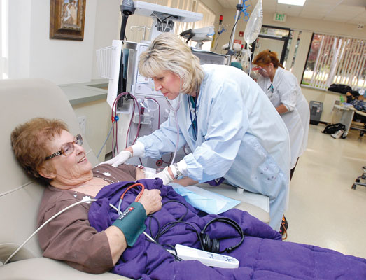 Because humans cannot live without at least one kidney, the function of which is to remove toxins and waste from the blood, for about the last year Knapp, 63, has traveled to Gilroy four times a week to undergo supervised dialysis treatments at the Satellite Healthcare dialysis center.