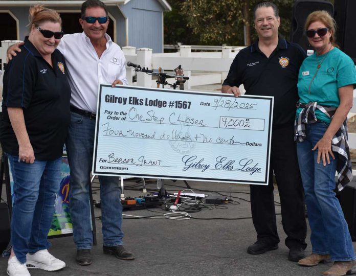 At this event, the Exalted Ruler Bruce Parker and Angela Moore CHEA Association Vice President from the Gilroy Elks Lodge presented the founders of One Step Closer Therapeutic Horsemanship facility, Mark and Landa Keirstead, a check for $4,000 for the Elks reinvestment into our community from Elks National Foundation Community Investments Program Beacon Grant.