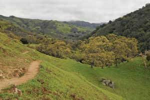 The rest is pure pleasure. Canyon View Trail levels off and travels through oak-dotted open grasslands and truly lives up to its name with sweeping views across Alameda Creek below. This time of year, the new yellow-green leaves popping out on the valley oaks against the deep green grass of the hills is a feast for the eyes.