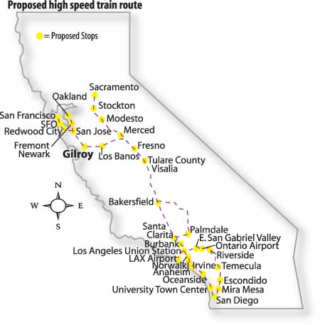 If Pacheco Pass is the chosen route for the rail, Gilroy will be one of the rail’s limited Bay Area stops. If the rail authority chooses the Coe Park route, the train will go through Morgan Hill, bypassing Gilroy, according to Carrie Pourvahidi, the deputy director of the California High Speed Rail Authority based in Sacramento.
