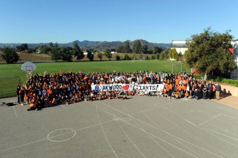 The entire student body, faculty and staff of Oakwood School was invited to dress in Giants colors and logo wear Tuesday. This planning began several days before their thrilling World Series win – and everyone turned out brilliantly in the orange and black the morning after the World Champion Giants claimed their well-deserved title.