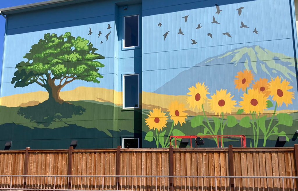 The mural depicts a “vivid panorama” of nature scenes often found in Morgan Hill—including an oak tree, mountaintop, sunflowers and birds in flight.