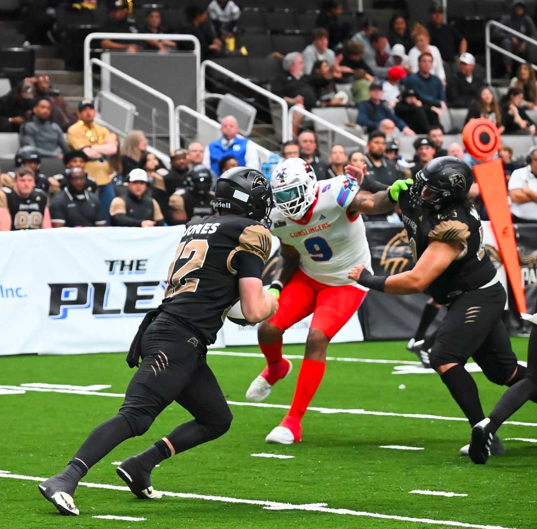Pictured is Panthers quarterback Josh Jones carrying the ball against the Gunslingers defense.