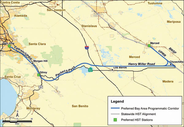 The rail authority presented construction options to about 50 locals gathered Monday night for a scoping meeting at the Hilton Garden Inn. The trains, which will run along 800 miles of track from San Francisco and Sacramento in the north to Los Angeles and San Diego in the south, will eventually carry 93 million passengers annually, according to the authority’s projections. Locally, the preferred alignment runs up the Central Valley, tunnels east through Pacheco Pass, then heads north toward San Jose, with a stop in downtown Gilroy.