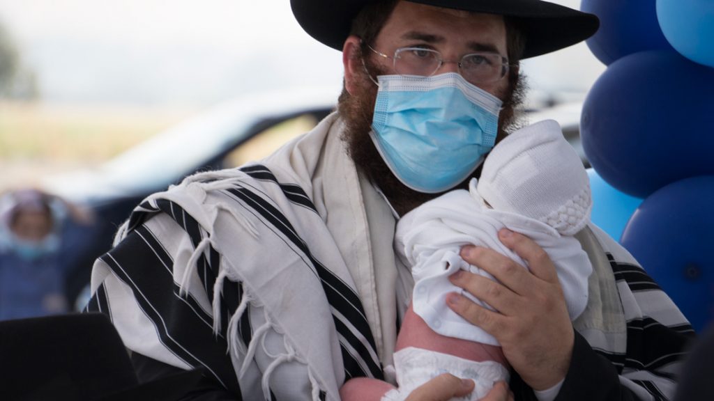 Members of the area’s Chabad community gathered Sunday morning to celebrate the naming and ritual circumcision of Chani and Rabbi Mendel Liberow’s eight-day-old son. Rabbi Liberow, who heads the Morgan Hill-based Chabad South County Jewish Center, is second from right in the photo above and the surgeon, known as a mohel, is in blue scrubs. The bris procedure was performed in the parking area of the Morgan Hill Aquatics Center. The drive-in ceremony, which may be a first, allowed well wishers to safely observe from a distance.