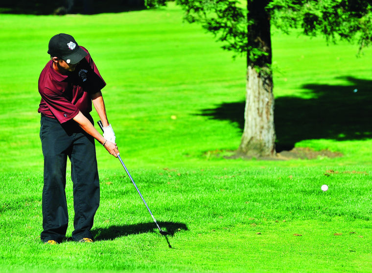 Sobrato number one player Kyle Brown chips his ball onto the green at hole four Tuesday during BVAL finals at Coyote Creek Golf Course.