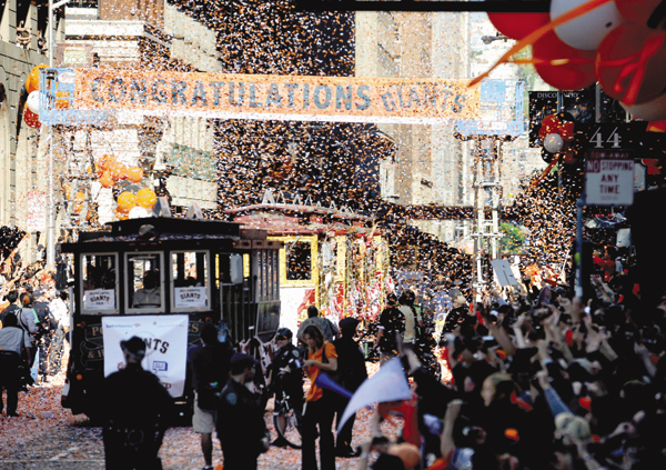 The Giants ride down Montgomery Street in a ticker tape parade