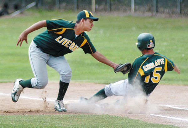 Live Oak’s varsity player Anthony Austin tags out Acorns’ alumni