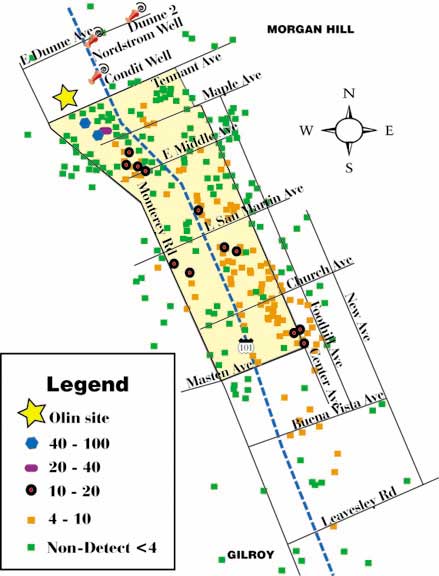 Since mid-January, Olin and the Santa Clara Valley Water District, under supervision by the regional water board, have been testing wells to see how far the chemical has traveled from its origins at Tennant and Railroad avenues in Morgan Hill.