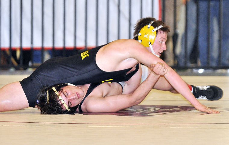 Live Oak’s Derek Peralto wrestles with Mitty’s Alex Kerkeles during their 152-pound match Saturday during Central Coast Section Championship. Peralto placed third.